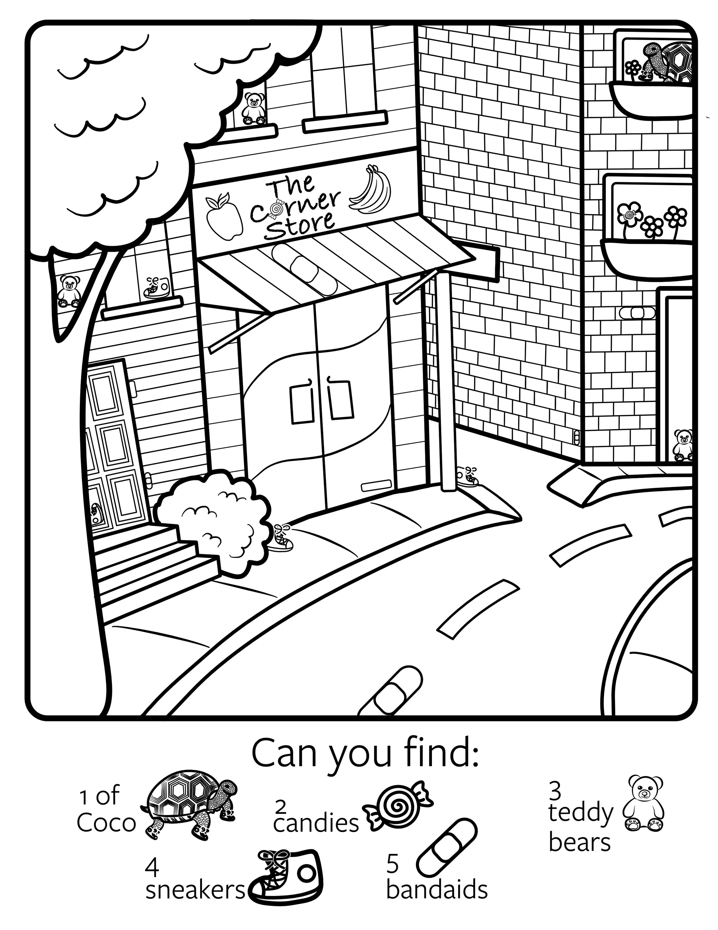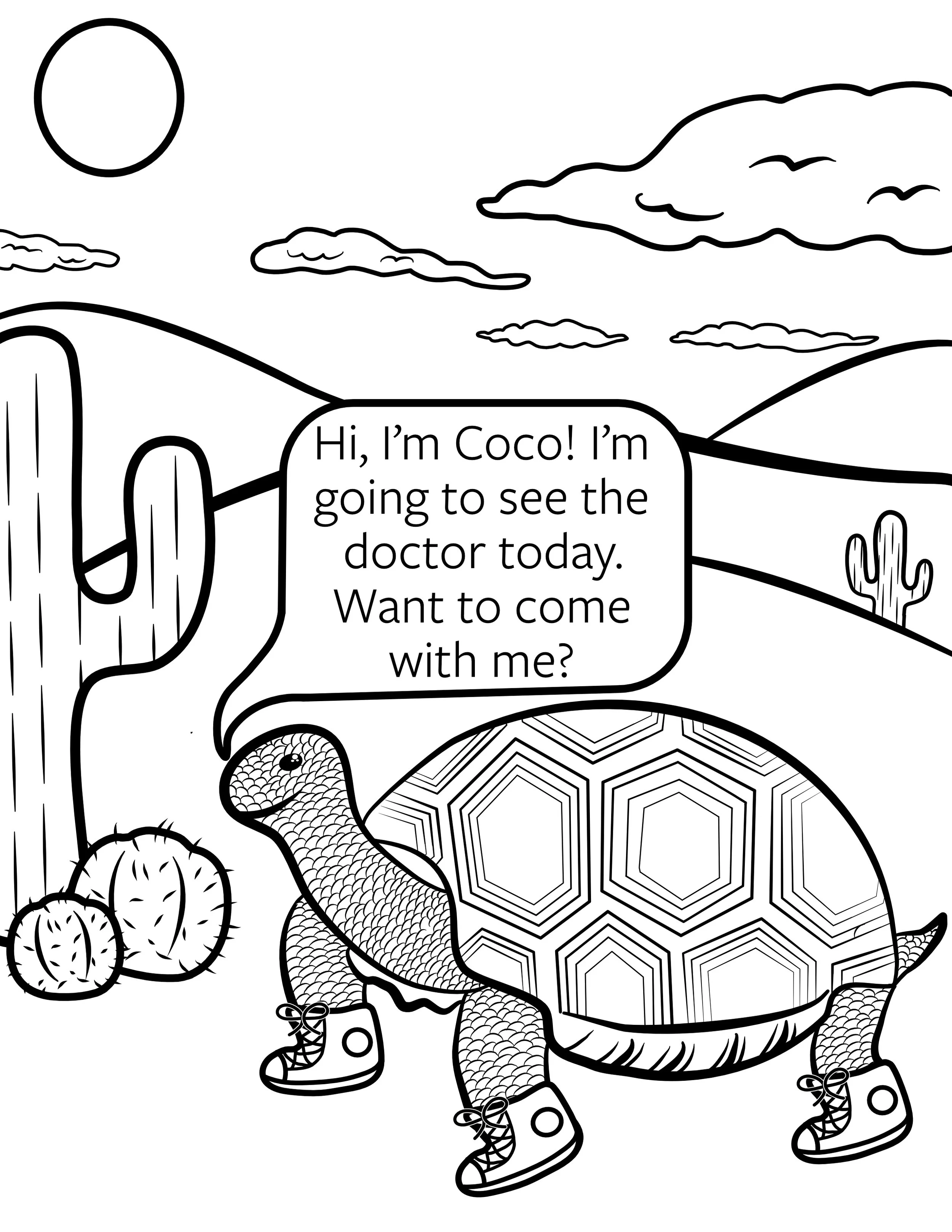 I created Coco the tortoise to serve as a character through coloring pages that children receive at study visits. Coco goes through similar things that children might experience at these study visits and these pages aim to reduce anxiety about visits.